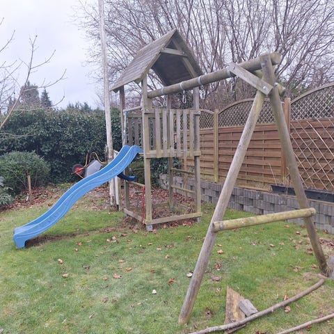 Et styk legetårn med gynge. Du skal selv kunne skille det ad