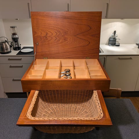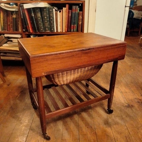 Smukt sybord I teaktræ og fletkurv.