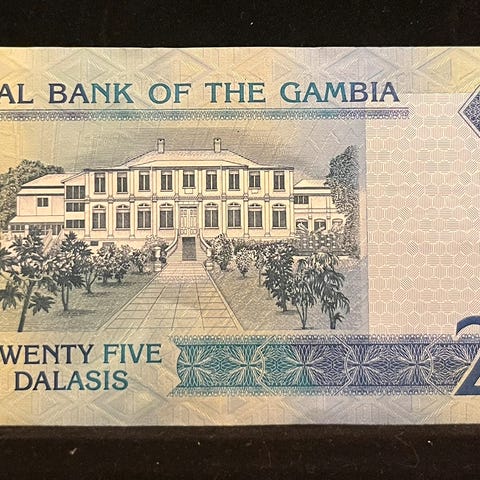 Central Bank of The Gambia One Dalasi sedler bestående af flere sedler med forskellige numre. Sedlerne viser portræt og traditionelle motiver, primært i lilla og grå farver.