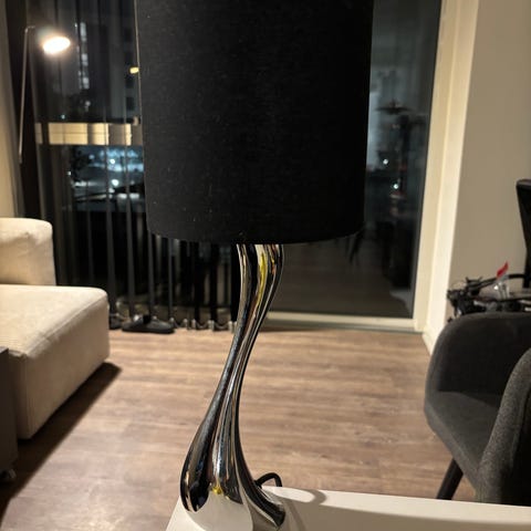 Den sorte skærm komplementerer den skulpturelle form og skaber en harmonisk balance mellem modernitet og klassisk design.