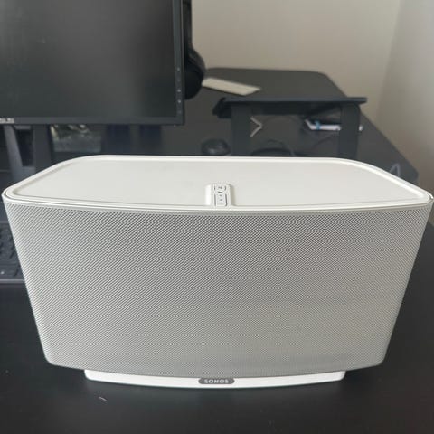 Sonos Play:5 højttaler i hvid og sort farve. Højttaleren er designet til at levere lyd i høj kvalitet til brug i hjemmet.
