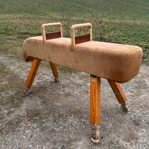 • Stand: Den har den helt rigtige patina, der vidner om mange års brug i en gymnastiksal. Læderet er intakt, og benene står stabilt.