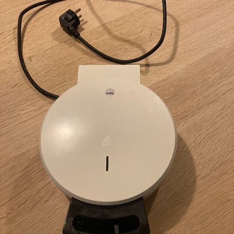 Wilfa Gode Råde med non-stick belægning og justerbar temperaturkontrol. En elektrisk enhed designet til at bage vafler med dekorative mønstre på begge plader.