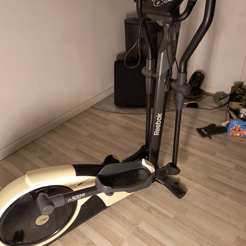 Reebok Fusion Crosstrainer træningsudstyr i grå farve. Maskinen er designet til hjemmebrug og har en digital skærm til styring af belastning og visning af træningsdata. Den har pedaler og håndtag til helkropsmotion.