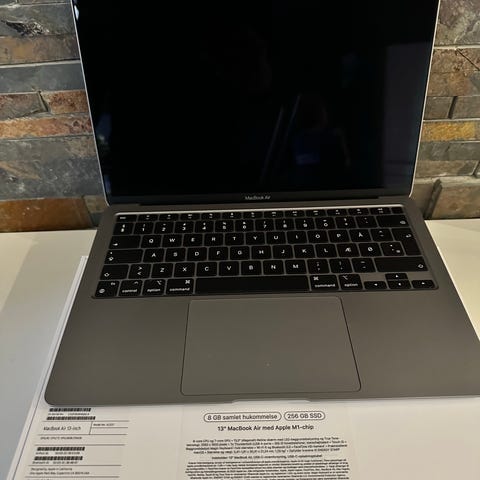 Den kommer med original oplader samt nyeste macOS Tahoe