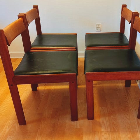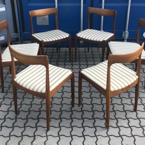 6 spisebordsstole i massiv teak fra 1960’erne. Står rigtig flot i træet. Betrækket på den ene stol er beskidt.