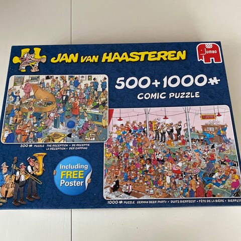 Jan van Haasteren Comic Puzzle med 950 brikker. Puslespillet har et farverigt og detaljeret motiv, der forestiller et nabolag. Inkluderer også en puslespilsposter.