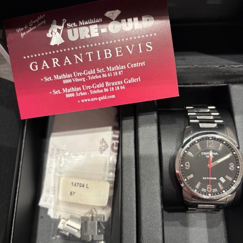 Stilrent Certina herre ur i sølv med mørkebrun læderrem. 5 år gammelt, sparsomt brugt og med helt nyt batteri.