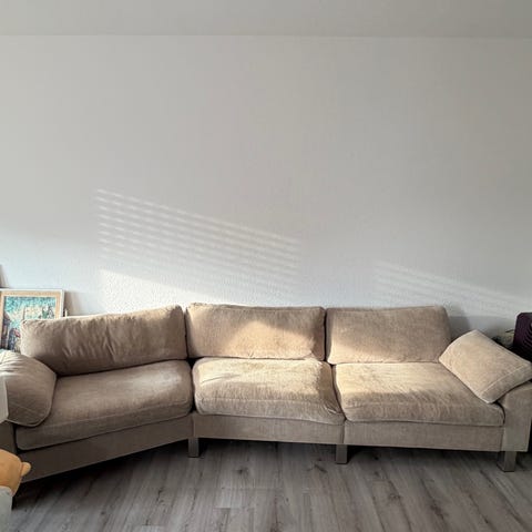 Sofaen trænger til læderfedt og nogle lynlåse virker ikke mere, hvilket er grunden til den lave pris.