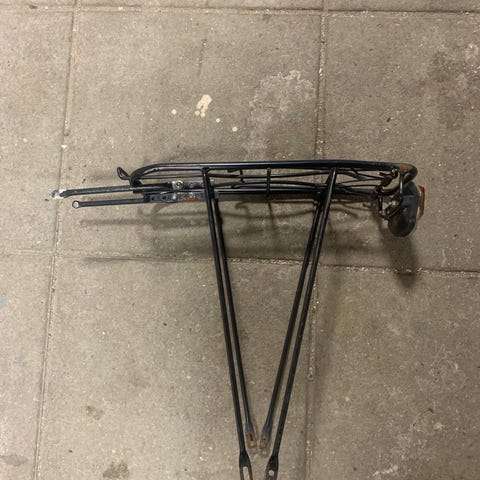 Bagagebærer til cykel i sort metal. Designet til montering på cyklens bagstel for at bære tasker eller andet udstyr.