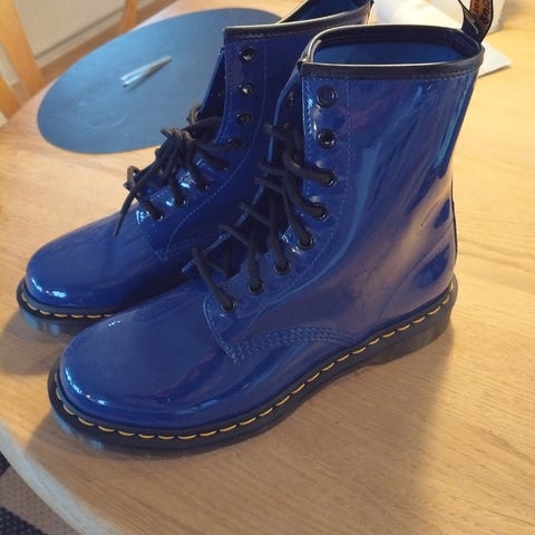 Dr. Martens støvler i størrelse 43 med blå lakmateriale. Støvlerne har snørebånd og en slidstærk sål med karakteristisk mønster. Velegnede til dagligt brug.
