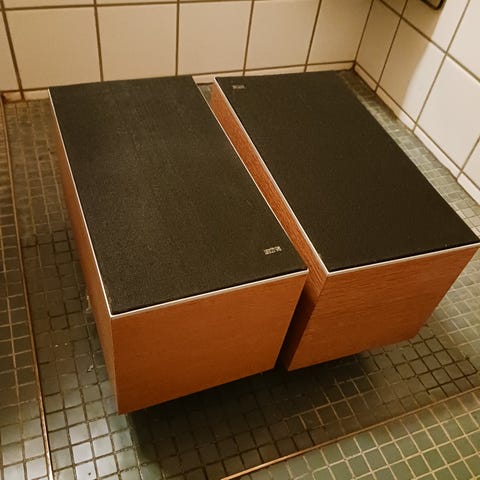 To gamle Beovox 1600 højttalere i teaktræ.