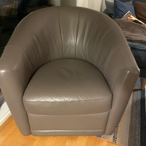 Lækre lænestol / sofastol. Stel i lakeret bøg, med brunt læder. Sædehynder er ompolstret for bedre siddekomfort. Sædehøjde: 45 cm.