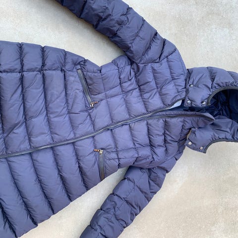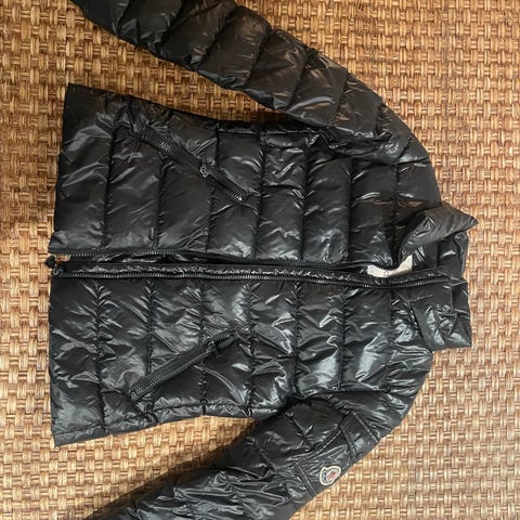 Moncler pige dunfrakke i størrelse 164, blå farve og lavet af dunmateriale. Jakken har hætte og lynlås, og er designet til børn.