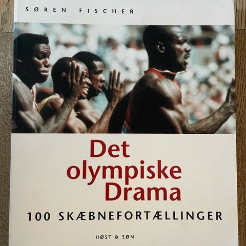 Søren Fischer Det olympiske drama bog med 100 skæbnefortællinger. Indeholder historier og beretninger om olympiske begivenheder og atleter. Bogen er illustreret med billeder og tekst, der beskriver forskellige olympiske dramaer og sportslige præstationer.