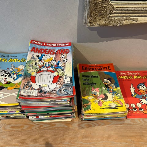 Anders And og Co. tegneserier i forskellige udgaver og størrelser. Indeholder flere numre med varierende indhold og illustrationer. Egnet til samlere eller læsere af klassiske danske tegneserier.