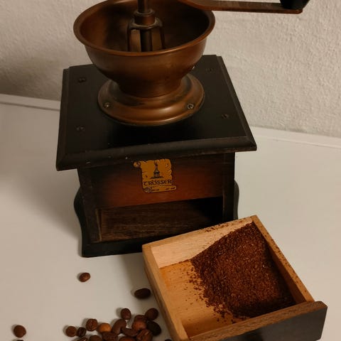 Her sælges en antik støbejerns kaffekværn. Den er vist tussegammel. Virker fint. ☺️