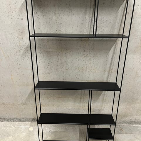 Sort metal reol med flere hylder i forskellig størrelse. Reolen har et åbent design og kan bruges til opbevaring eller fremvisning af genstande i hjemmet eller kontoret.