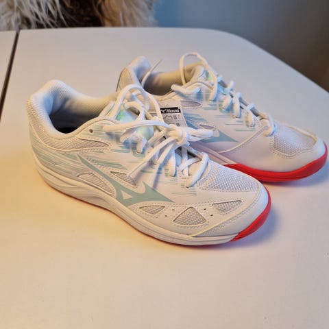 Mizuno sportssko til børn i størrelse 38. Skoene er hvide med blå detaljer og designet til forskellige sportsaktiviteter. Materialet og farverne er velegnede til aktiv brug.