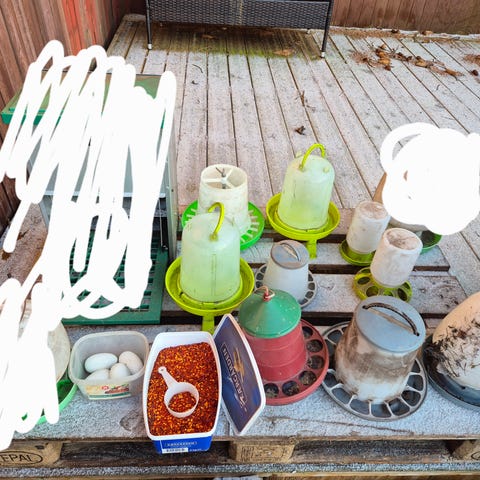 Forskellige ting til høns fode og drikke tru og transport kasse alt hvad vi kan finde frem for 500 kr