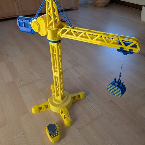 Stor kran med fjernbetjening til at styre kranen rundt og kloen op og ned.