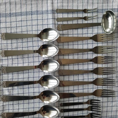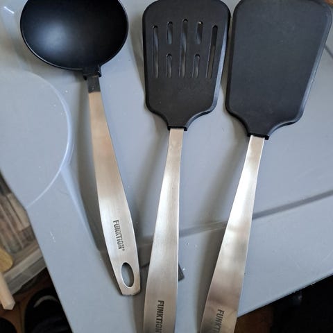 Sælger denne samling af praktiske og robuste køkkenredskaber i rustfrit stål. Sættet indeholder alt det vigtigste til madlavningen og fremstår i pæn, brugt stand. Designet er klassisk og tidløst med lange, flade skafter (ligner Eva Trio stilen).