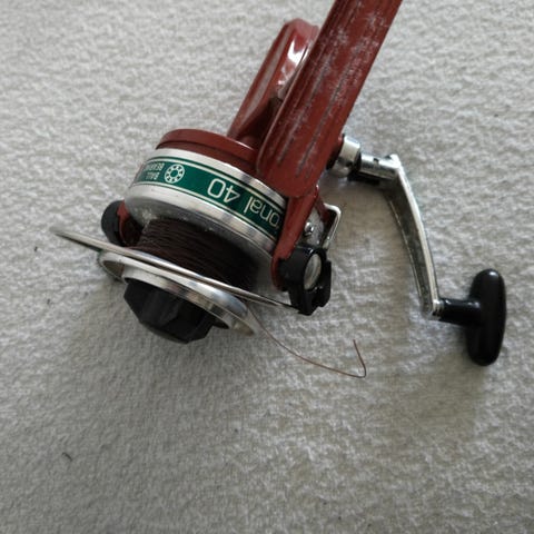 ABU Cardinal 804 spinnehjul med monteret blå fiskeline. Hjulet har en sort og guld farvet spole og et håndtag til at dreje med. Designet til fiskeri med en robust konstruktion.