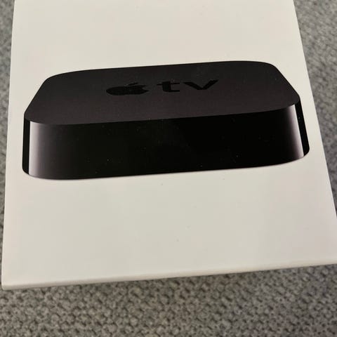 Apple Apple TV streaming-enhed i sort farve. Enheden bruges til at streame digitalt indhold til tv-skærme og er kompatibel med forskellige streamingtjenester.
