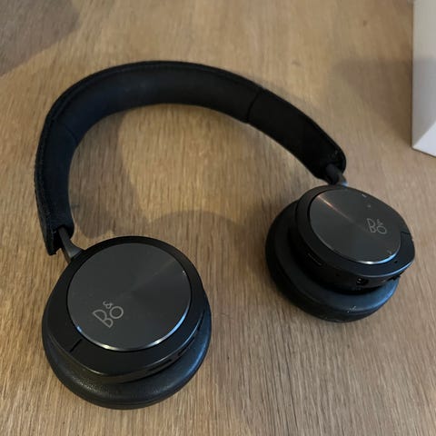 Bang & Olufsen hovedtelefoner i sort farve med polstrede ørepuder og justerbar hovedbøjle. Designet til at give lydoplevelse med fokus på komfort og lydkvalitet.