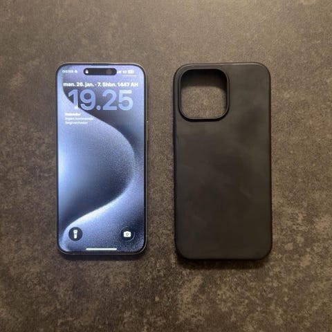 Apple iPhone 15 Pro Max smartphone med 512 GB lagerplads. Enheden har en sort farve og leveres med sort dbramante læder cover og skærbeskyttelse.