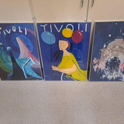 Plakat med motiv af en hest og en måne mod en mørk baggrund med teksten 'Tivoli'. Plakaten er indrammet og har en ophængningssnor på bagsiden. Farverne inkluderer blå, sort, hvid, rød og gul. Plakaten er velegnet til vægophæng.