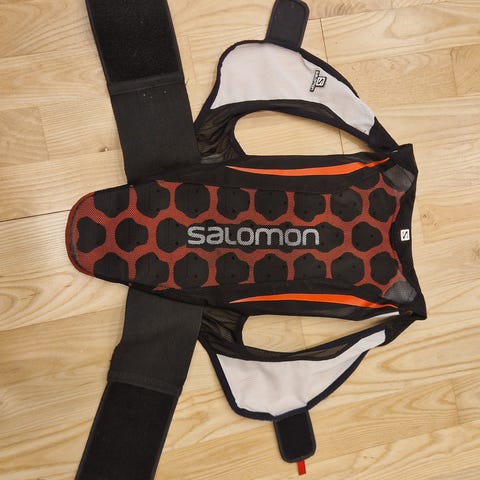 Salomon skjold i størrelse JXL (21-24). Farverne er sort og rød.