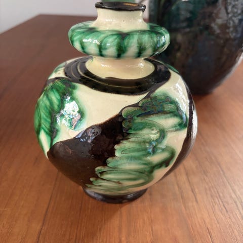 Kande eller vase fra Kähler i rød lustre formgivet og signeret af Karl Hansen Reistrup. Mål: cirka 35x27 cm (hvor bredest). Med munding formet som hoved af kamel, får, dromedar ell lign. Sjælden. Jeg har ikke set lignende før. I fin stand med enkelte aldersrelaterede, mindre afslag. Stor og tung, så afhentning at foretrække.