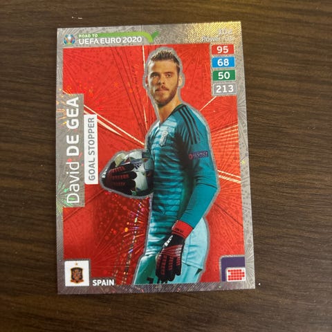 Topps David De Gea fodboldkort med spillerinformation og statistikker. Kortet viser David De Gea som målmand for Manchester United, med en samlet vurdering på 99. Kortet indeholder detaljer om hans færdigheder og præstationer.