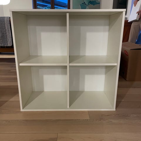 Pæn og enkel hvid reol sælges. Reolen har 3 rummelige sorte stofskuffer samt en mindre åben hylde øverst, som er perfekt til opbevaring eller dekoration.