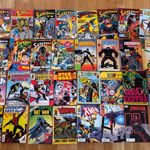 Samling af Marvel og DC Comics tegneserier med forskellige titler og karakterer. Indeholder klassiske og nyere udgaver med kendte superhelte som Spider-Man, Superman, Batman, Thor, X-Men og flere. Varierer i størrelse og udgivelsesår. Egnet til samlere og fans af tegneserier.