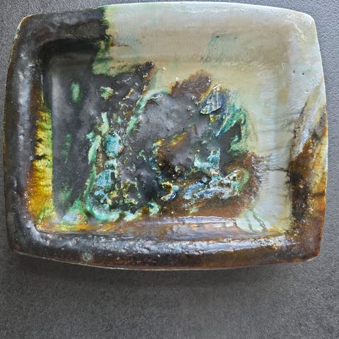 Jørgen Børgeholm keramik fad med dekorativt mønster. Fadet er rektangulært med afrundede hjørner og har en grå overflade med sort reliefudsmykning. Signeret af kunstneren Jørgen Børgeholm.