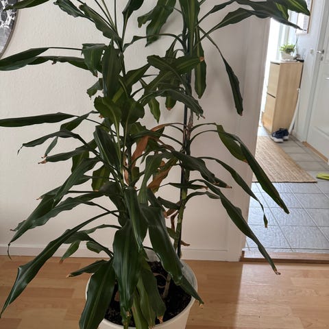 Grøn stueplante med brede blade i en grøn keramikpotte. Potten har en højde på cirka 23 cm. Planten er velegnet til indendørs brug og placering i vindueskarm.