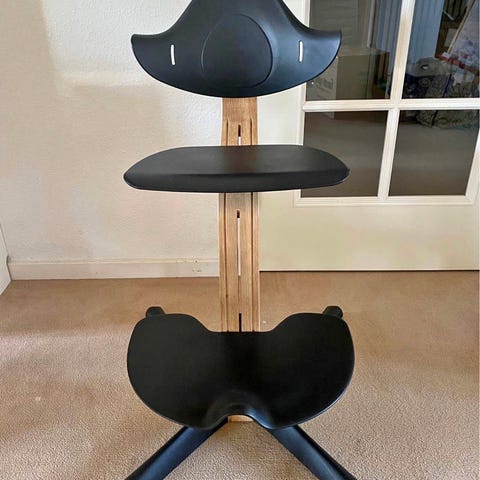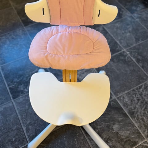 Stokke Nomi højstol i hvid med trædetaljer i eg. Sælges sammen med baby sæt i hvid, samt hynder i lysegrå. Rigtig god stol, nem at rengøre og i god stand.