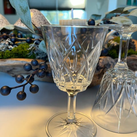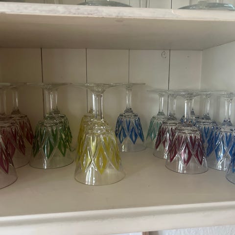 Smukke franske glas i stellet Reims med harlekin mønster. Virkelig smuk slibning - også på glassets fod.