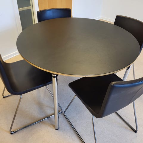 Rundt bord (diameter 110cm) og 5 stk. solide stole (formentligt bøg) med sort kunstlæderbetræk (4 stk. vist på billede)
