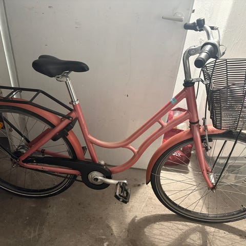 Rigtig fin Kildemose pige cykel i lyserød. Jeg kan desværre ikke se størrelsen på cyklen, men den passer ca 9-11 år. Godkendt lås, og cykelkurv på. Kan ses og prøvekøres på Nørrebro, tæt ved Forum metro station.