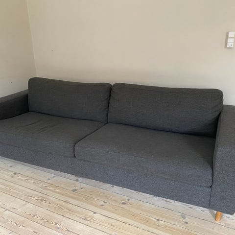 Sofa i mørk grå uld. Meget fin stand:) Gives gratis væk fra lav stuelejlighed. Køber henter selv.