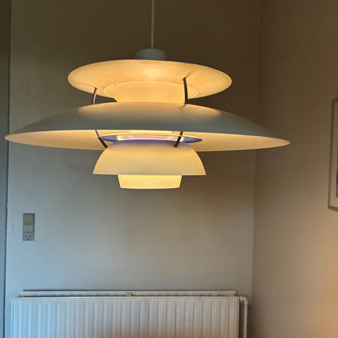 Blå Louis Poulsen PH5 loftslampe sælges. Den er dog i en stand som gør at den skal repareres. De tre metalafstivere er blevet bøjet og lampen er derfor skæv. Alle skærmene er i super fin stand og fejler ingenting.