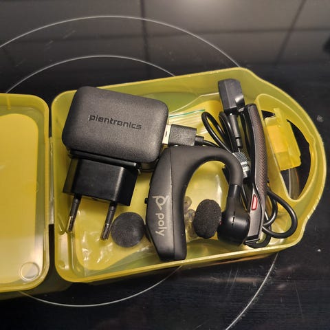 Plantronics bluetooth headset, passer både venstre og højre øre, med kassette til opbevaring og opladning, samt bordholder, stik usb-micro usb. Fin stand, alt fungere, ved 100% hilder det ca. 4 timer. PLT V5200