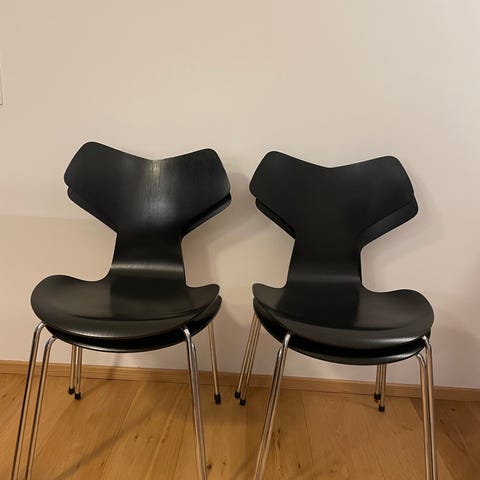 Sæt med 4 Grand Prix-stole designet af Arne Jacobsen og produceret af Fritz Hansen.