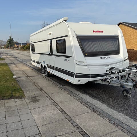 Dethleffs Beduin 765 med Isabella Erna (penta) fra 2021 med termotag 2varmeovne borde stole reoler kølefryseskab hjørnesofa ekstra bord plus stole i opbevarings telt med alt service alt hvad i ser på billederne følger med campingvognen står på fast plads i Fjellerup