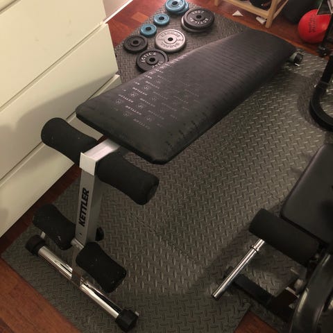 Kettler træningsbænk med tilhørende vægtstang og vægtskiver. Bænken er designet til styrketræning og kan bruges til forskellige øvelser som bænkpres. Produktet er velegnet til hjemmebrug og har en solid konstruktion.