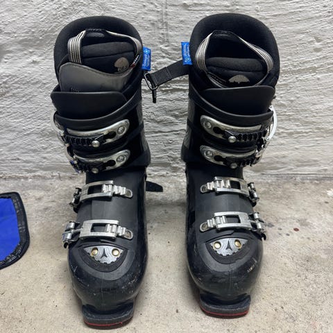 Atomic Hawk P100 skistøvler i størrelse 28,5 (325 mm) i farven rød. Skistøvlerne har fire spænder for justering og fastgørelse. Designet til skiløb med fokus på pasform og støtte.