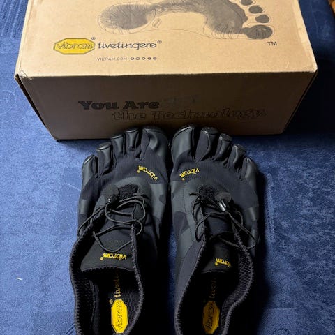 Brugte Vibram five fingers. Jeg har købt dem brugt selv, men fandt ud af at det var en dame model. Forskellen imellem dame og herre modellen er at dame modellen er smallere. Så den er for smal til min fod.